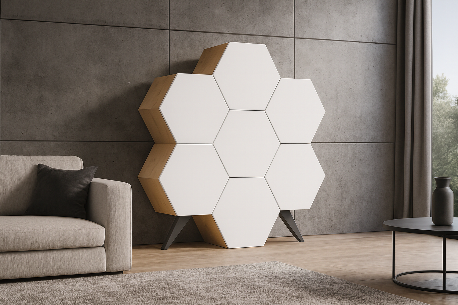Kuusnurksetest moodulitest koosnev pilgupüüdja igas kodus. Saadaval riiulite või sahtlitega variant.