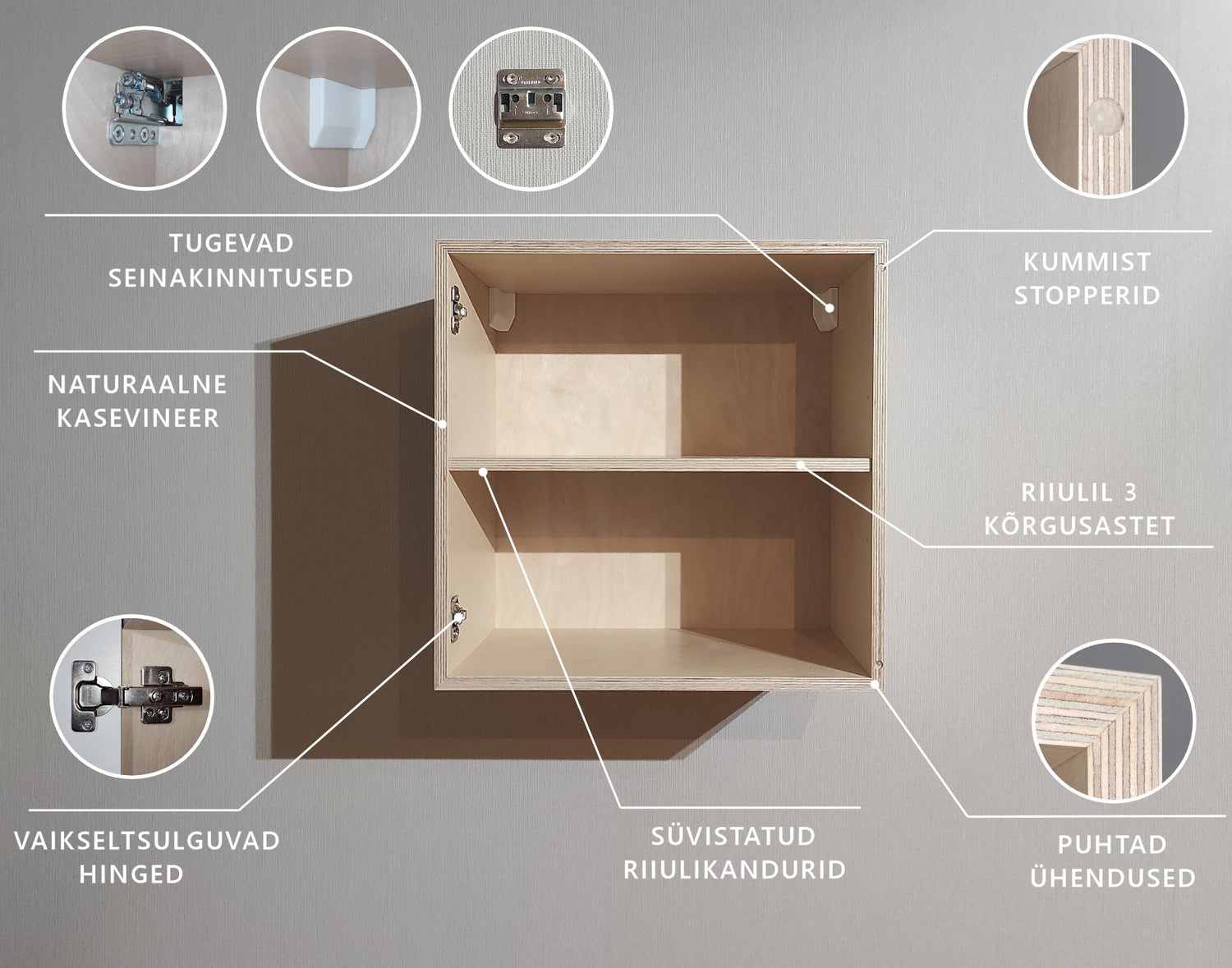- Korpus viimistletud naturaalsete Osmo õlivahadega. Uksed värvitud tervisele ja keskkonnale ohutu mööblivärviga.