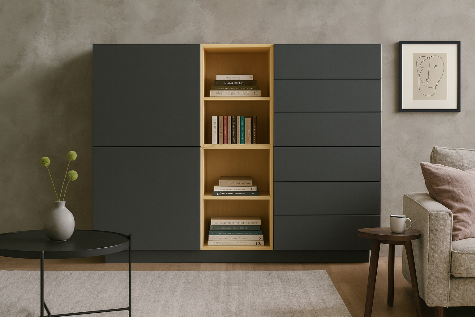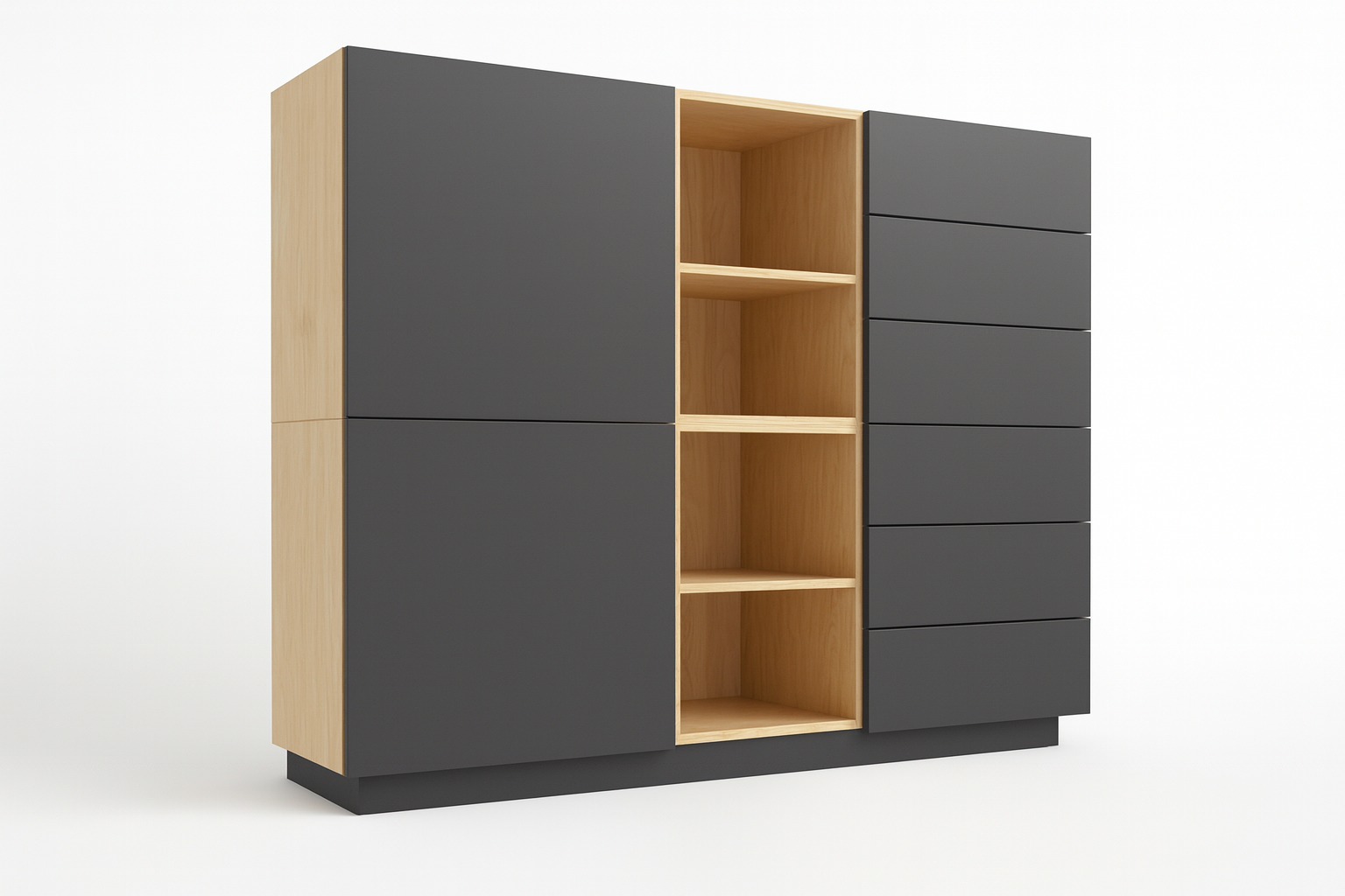 - Värv: Korpus ja sisu - naturaalne kask / Uksed - tumehall / Sokkel - tumehall.
