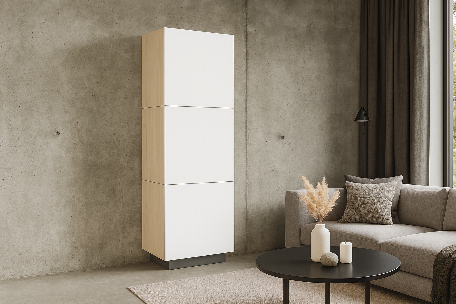 - Värv: Korpus ja sisu - naturaalne kask / Uksed - valge / Sokkel - tumehall.