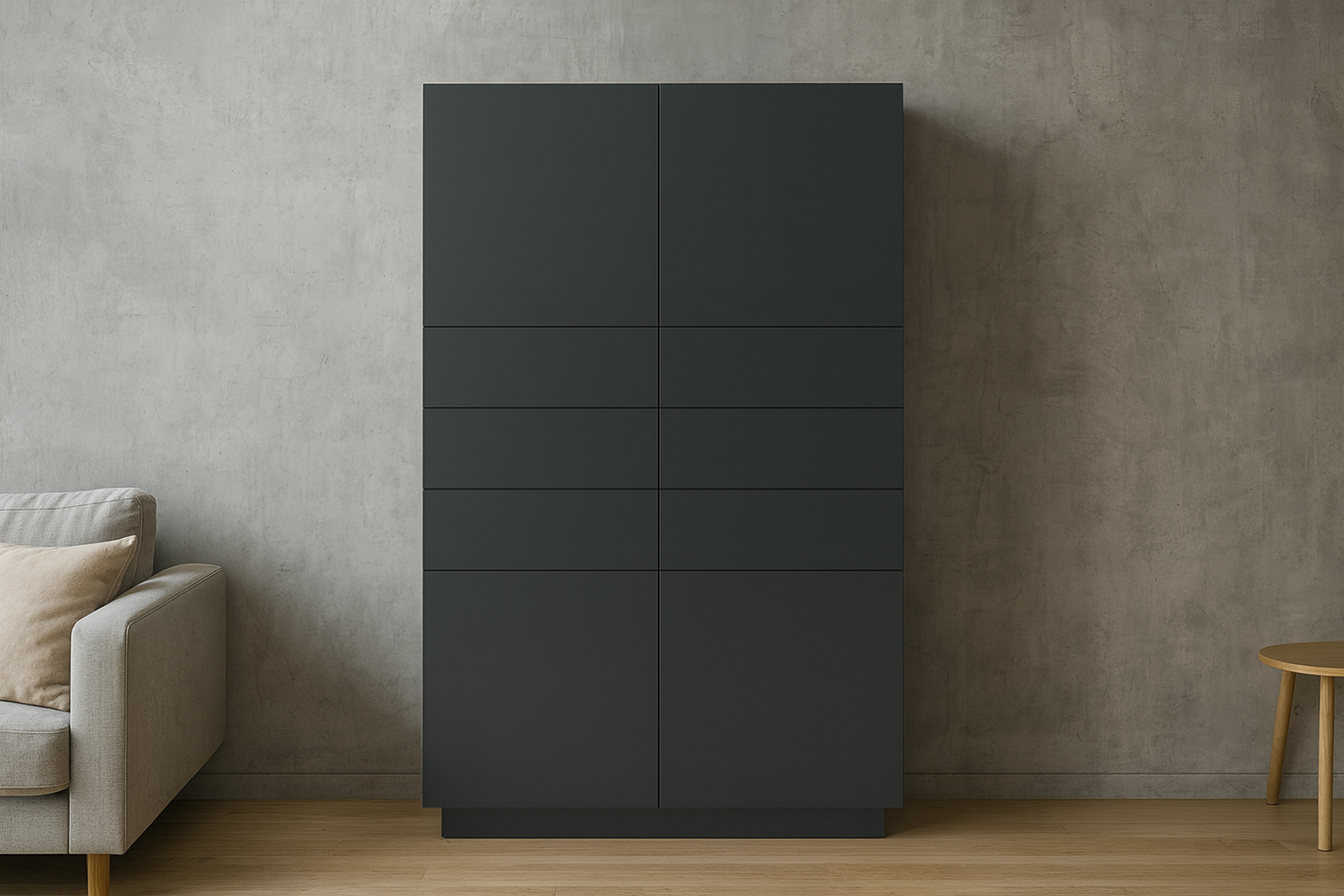 - Värv: Korpus ja sisu - naturaalne kask / Uksed - tumehall / Sokkel - tumehall.