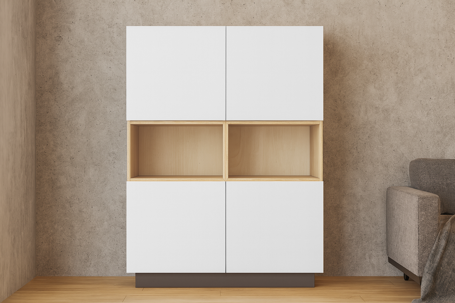 - Värv: Korpus ja sisu - naturaalne kask / Uksed - valge / Sokkel - tumehall.