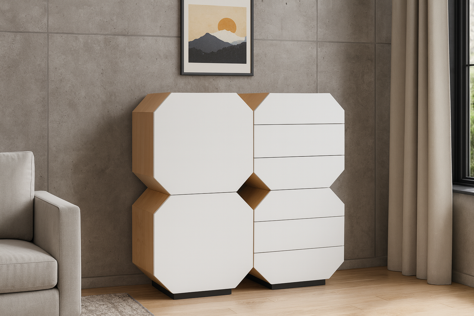 - Värv: Korpus ja sisu - naturaalne kask / Uksed - valge / Sokkel - tumehall.
